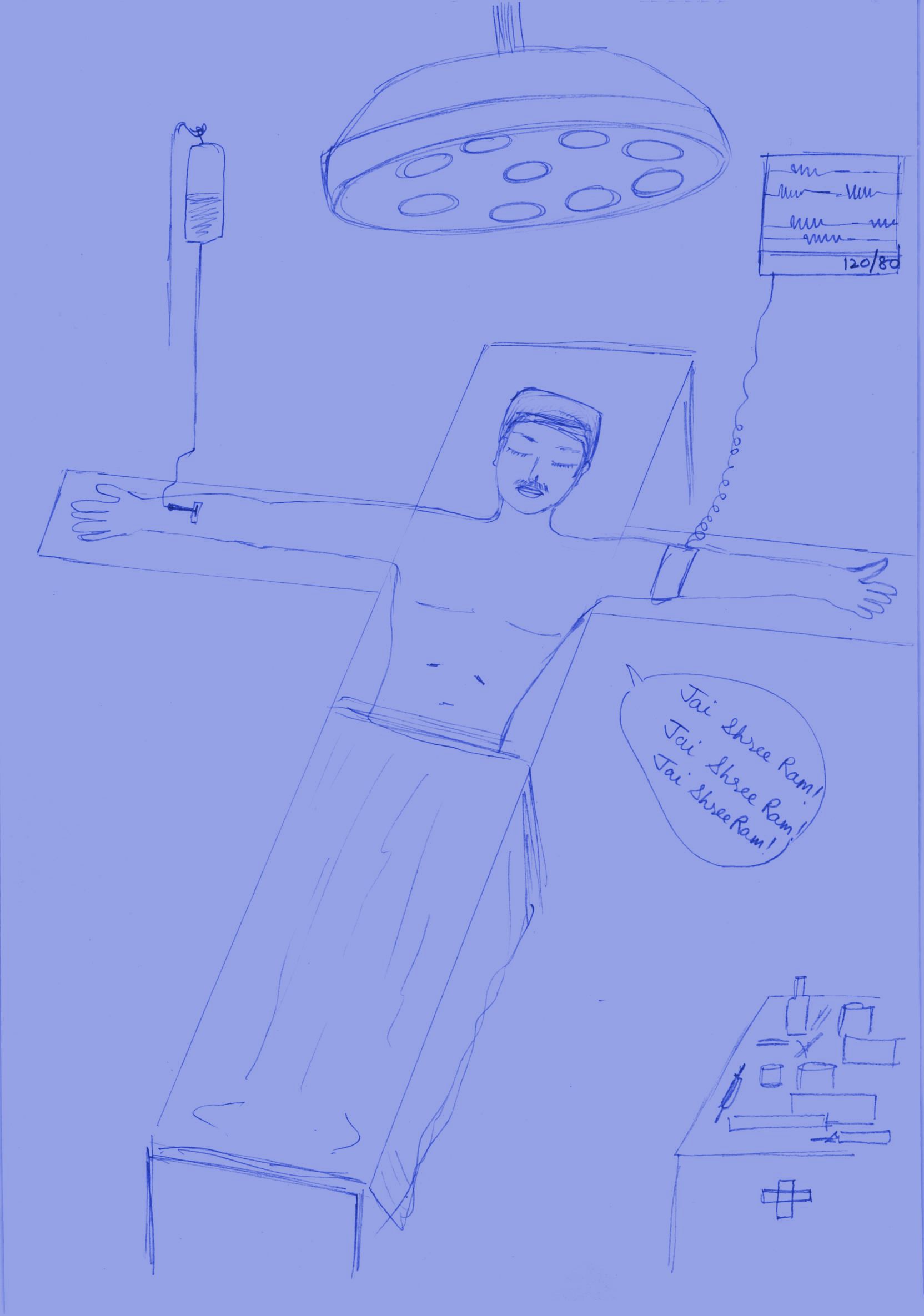 The operation was soon to begin. Sanjay had been given a mild sedative before being wheeled into the operation theatre. He was made to lie down on the operation table; his arms stretched on either side on a cross. Huge overhead discs of lights were focussed on him.