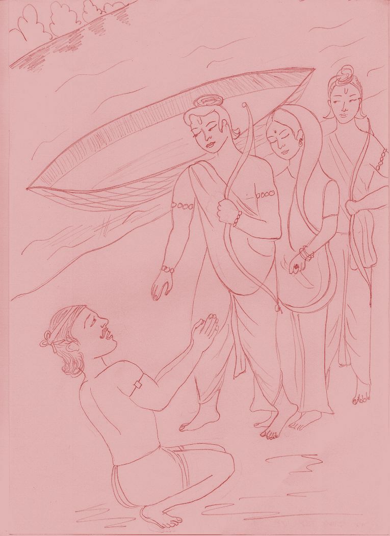 Kewat: Lord, both of us do the same work. I ferry people from this shore of the Ganges to the other. You ferry people across the ocean of Samsaara (Bhavsagar) through the journey of life. How can I accept payment from you?