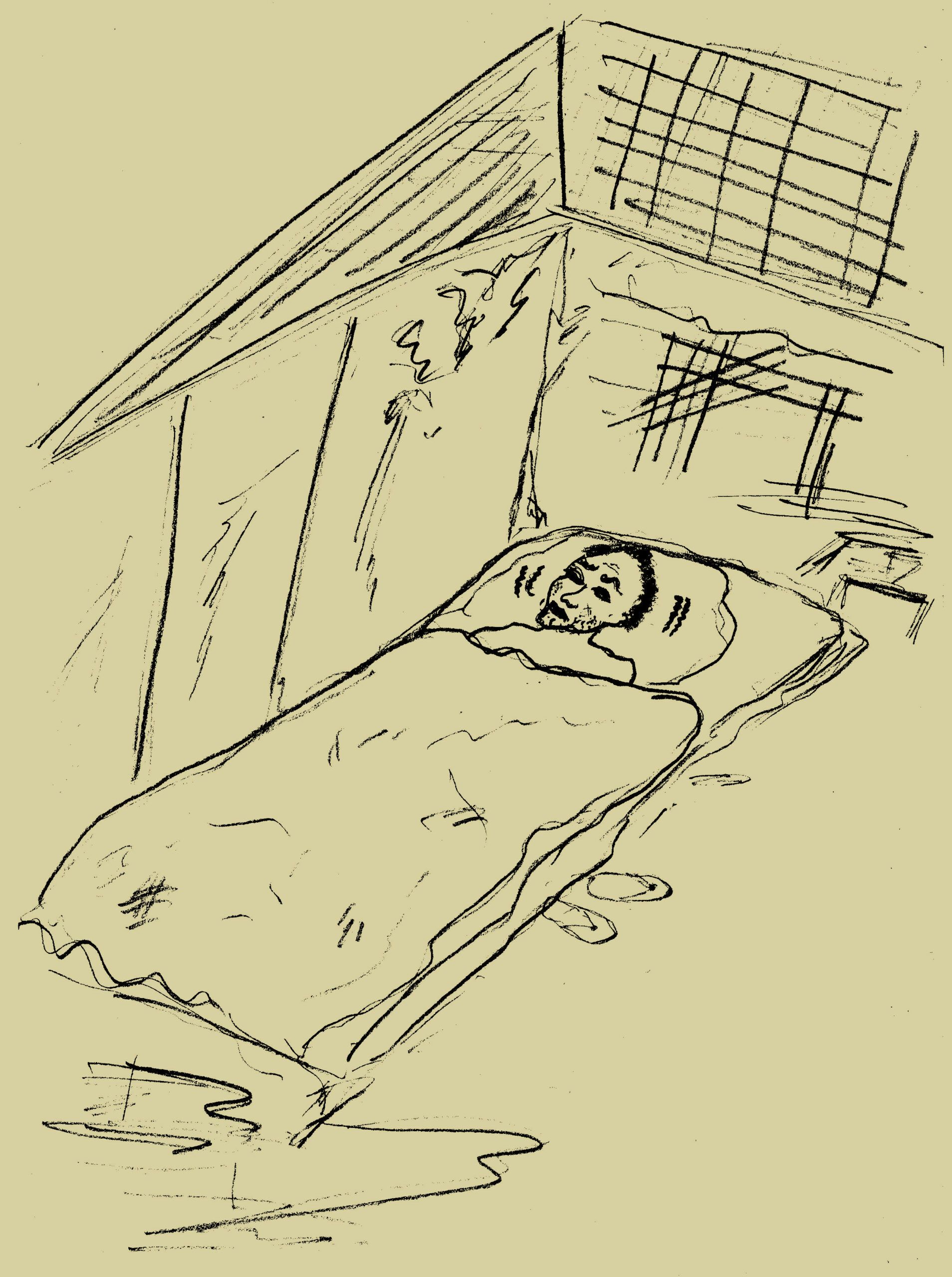 He gave him the Paracetamol tablet that the doctor had left earlier. He then helped the man to lie down again. He picked up his quilt and put it out on a bush for the Sun to dry up. The man got his own sleeping bag out of his rucksack and zipped up the old man into it. Next he got some adhesive tape out of his backpack and tried to plug the cracks in the roof.