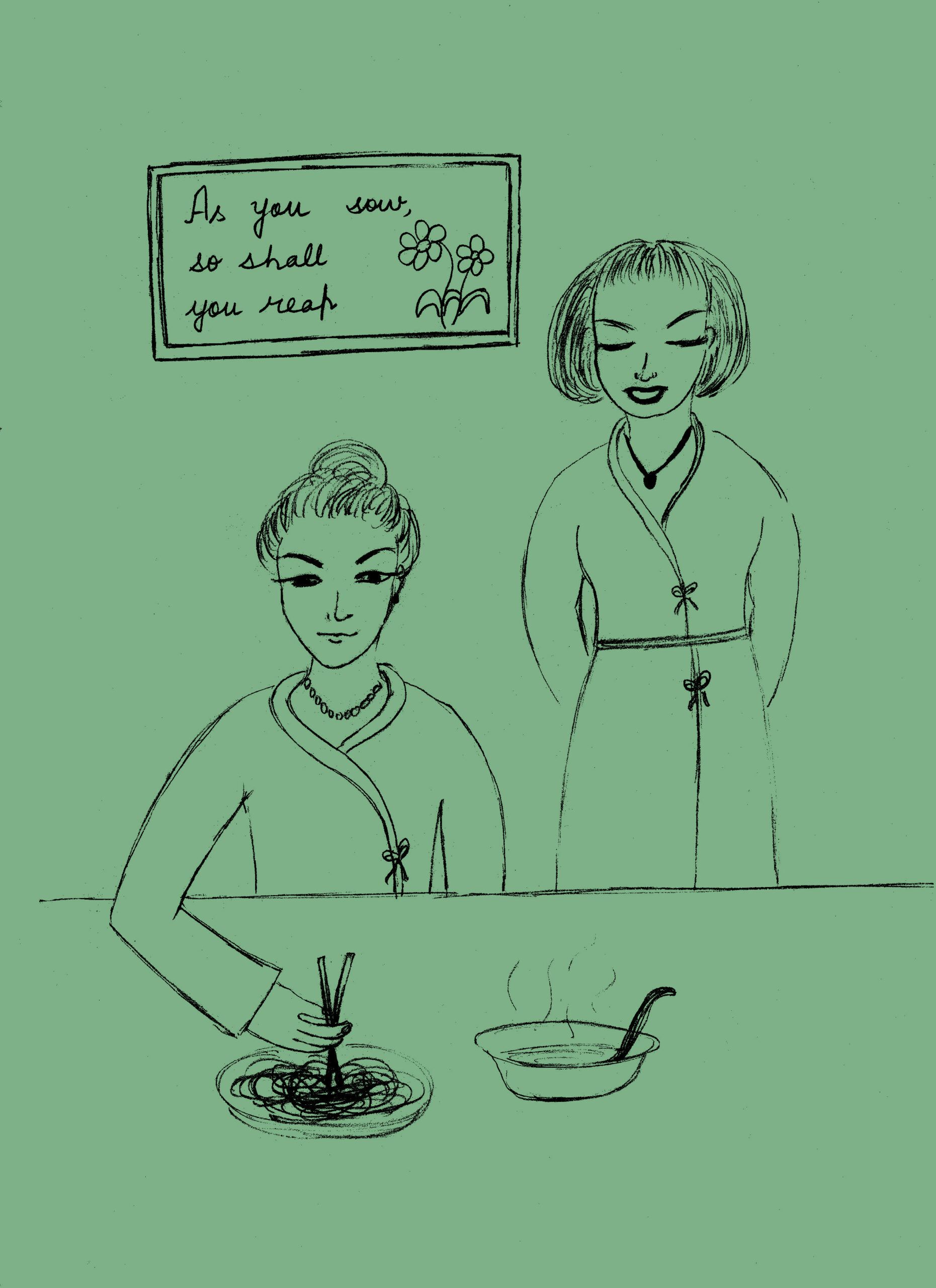 Weeks went by, and months went by, and every other day, Li-Li served the specially treated food to her mother-in-law. Li-Li had practiced controlling her temper to avoid suspicion. She hadn’t had an argument with her mother-in-law in six months because she now seemed much kinder and easier to get along with. The mother-in-law’s attitude toward Li-Li changed, and she began to love Li-Li like her own daughter.