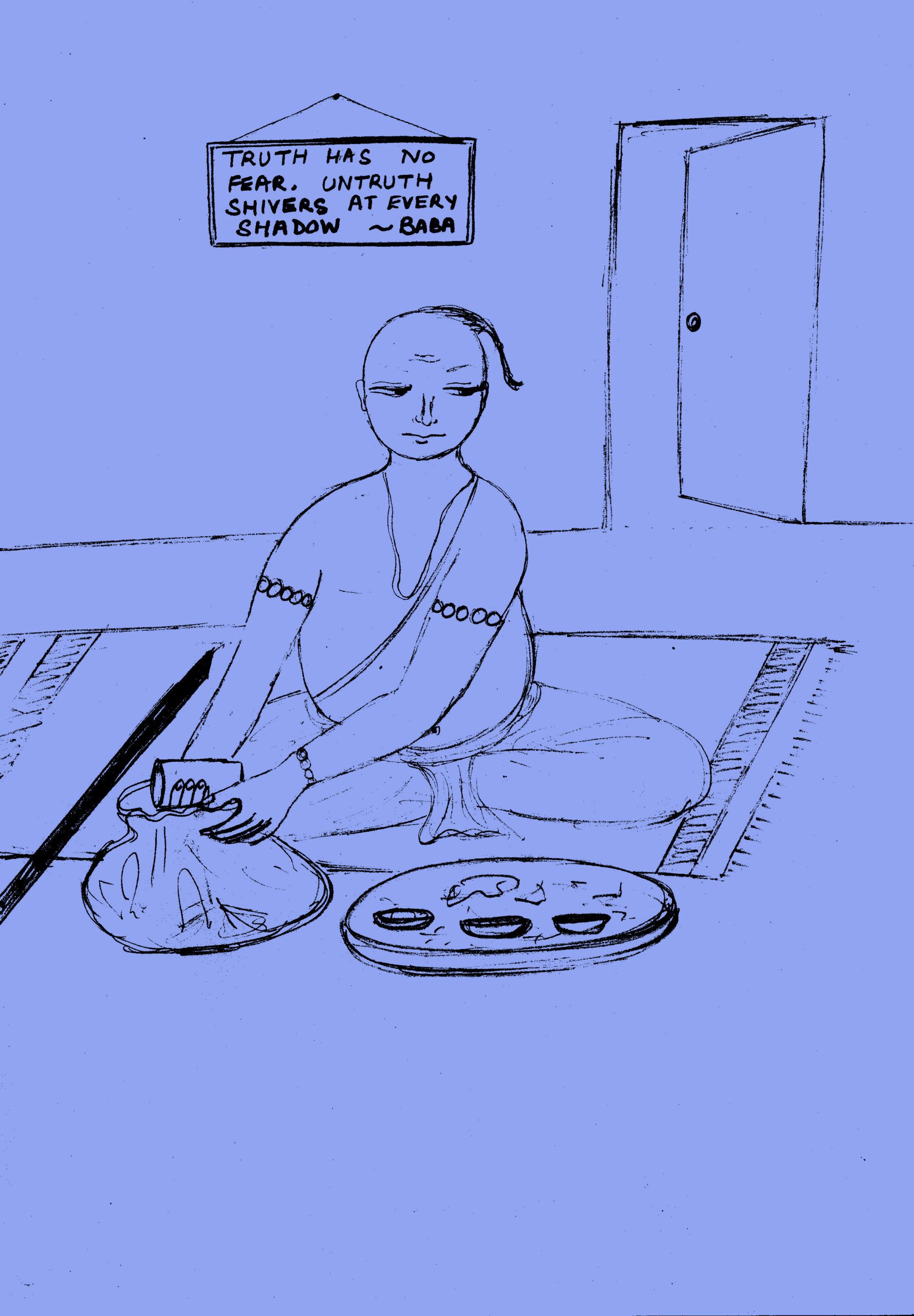 The Brahamin did not want to disturb his ailing wife, so he asked his neighbour to cook food for the Sadhu. While eating, the Sadhu eyed the beautiful silver glass in which the water was served. After finishing the food, the Sadhu quietly put the glass into his cloth bag and went out.