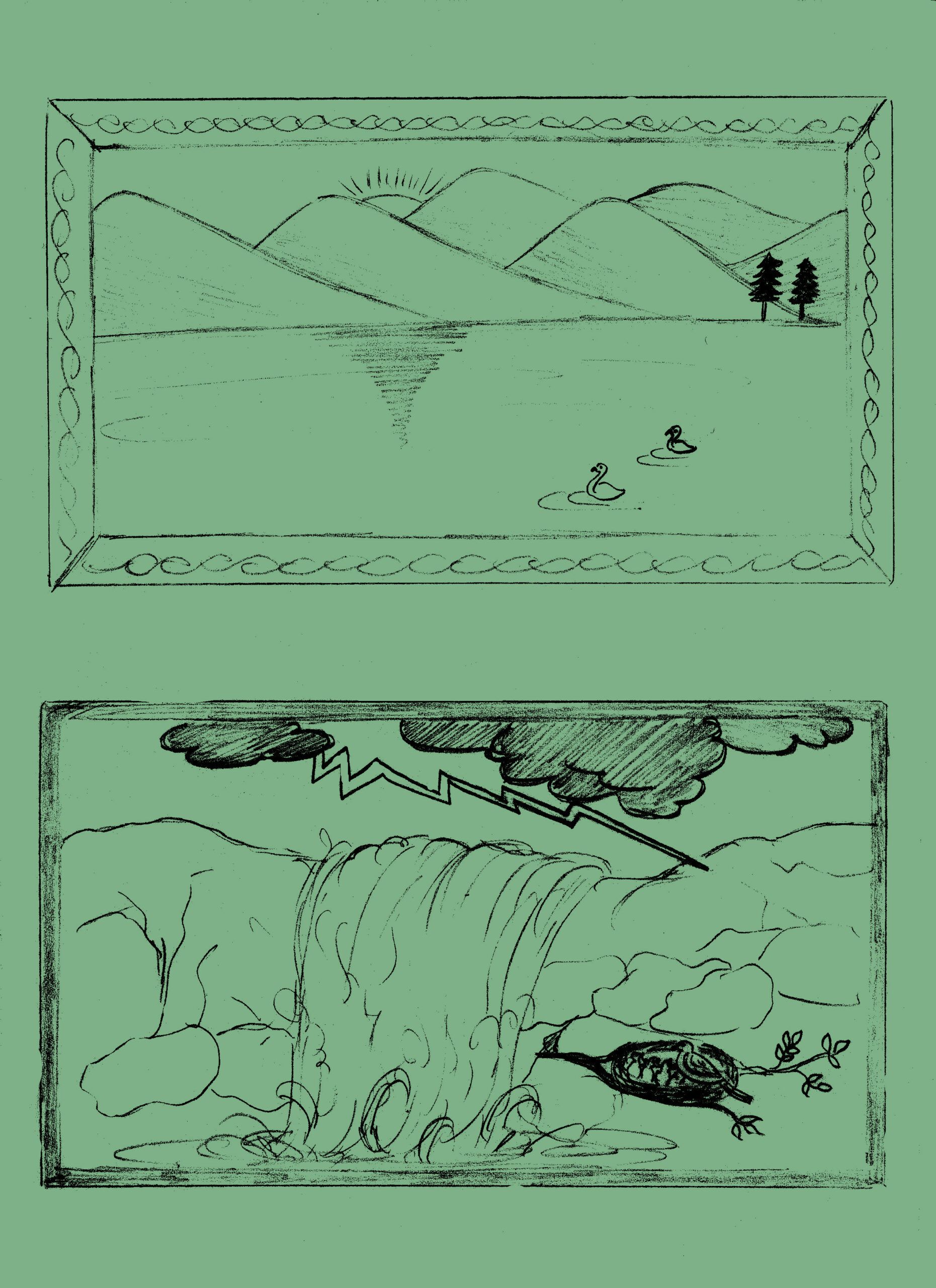 The other picture had mountains too. But these were rugged and bare. Above was an angry sky from which rain fell, and in which lightning played. Down the side of the mountain tumbled a foaming waterfall. This did not look peaceful at all. But when the King looked, he saw behind the waterfall a tiny bush growing in a crack in the rock. In the bush a mother bird had built her nest. There in the midst of the rush of angry water, sat the mother bird on her nest… Perfect Peace.