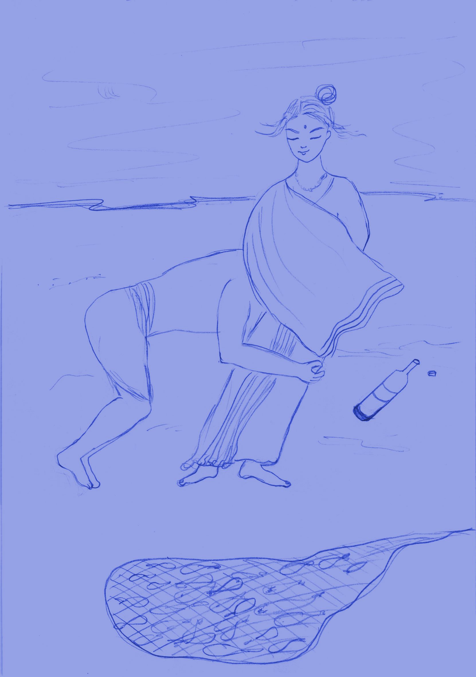 I was so exhausted when I reached the shore that I just had the food and the whole bottle of water and lay down on the sand. The cool breeze of the sea fanned me so beautifully that I dozed off. My mother lifted my head and placed it on her lap.