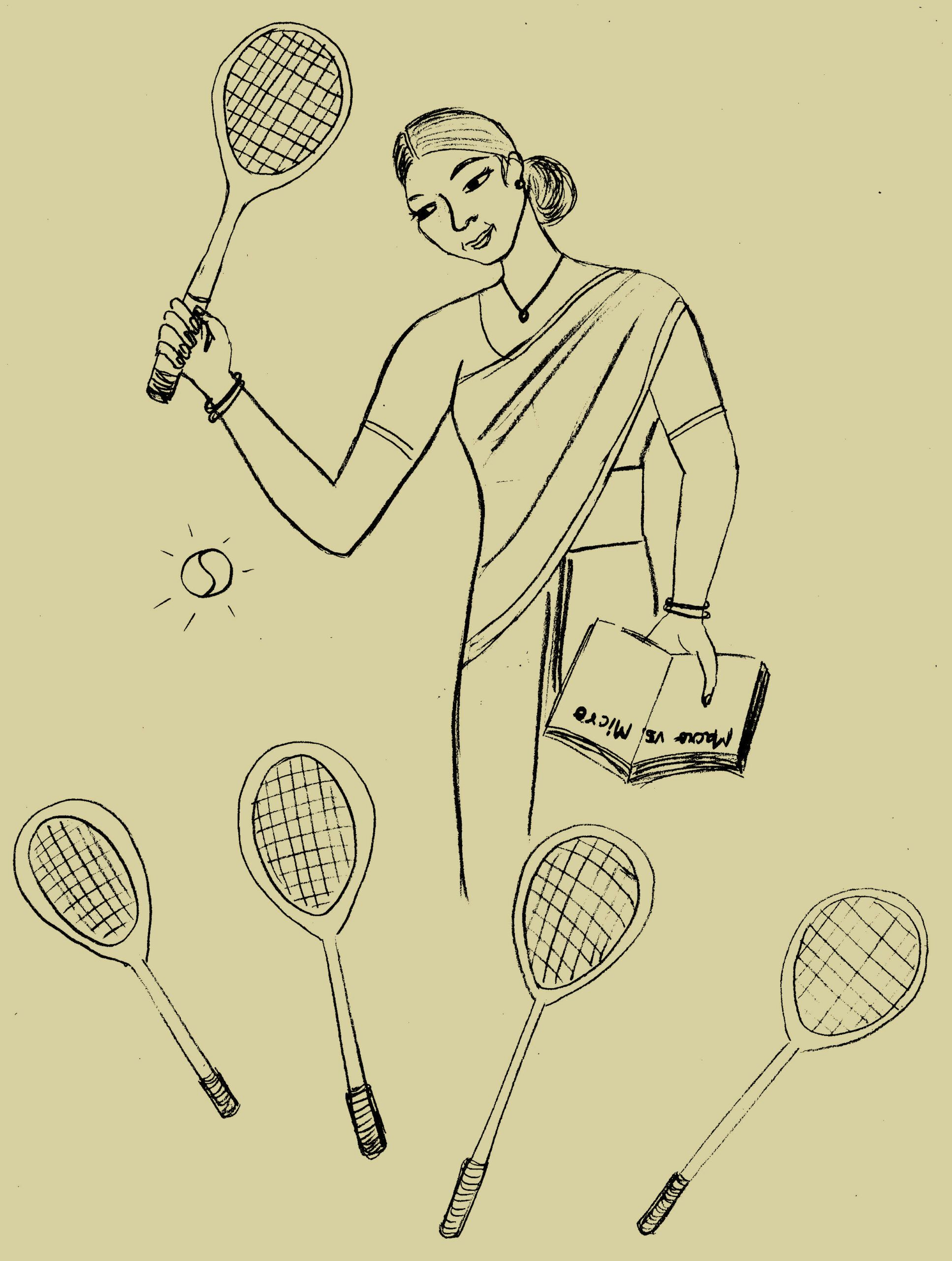 Mrs Muralidhar was trying hard to make herself heard above the buzzing and hissing sounds in the class. This class of B.Com 1st year was especially bad. They seemed to have endless things to chat about. They seemed to want to do everything but listen to Mrs Muralidhar who was trying her utmost to teach them the basic tenets of Macro Economics. After twenty minutes of unfruitful lecturing, she found her voice going hoarse and a splitting headache surfacing. She noticed that some of the students were repeatedly staring out of the window and at the sports centre. A lawn tennis match was going on and a lot of cheering could be heard.