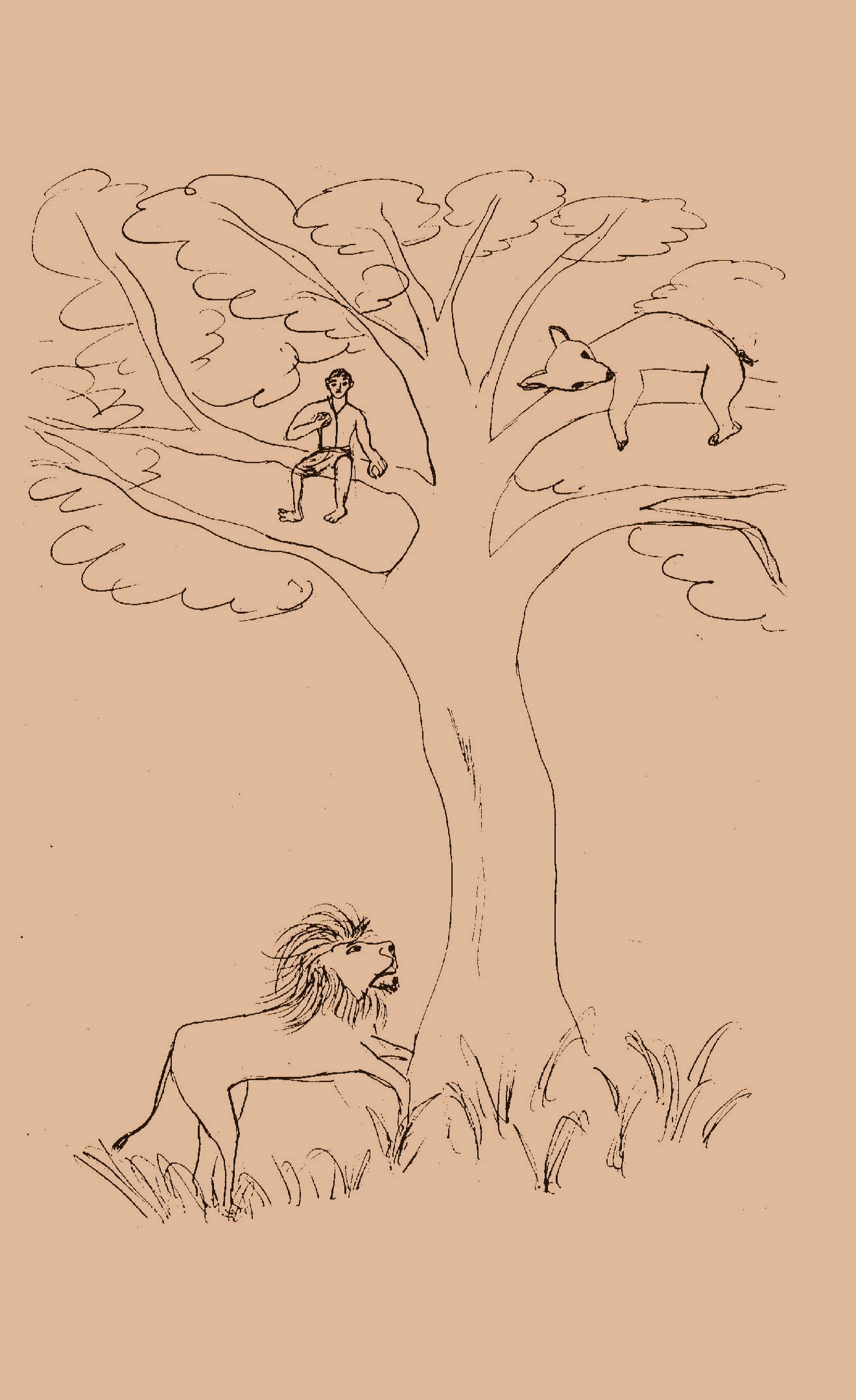 After a while, the bear went off to sleep. The man was utterly frightened and could not get a wink of sleep. The lion hovered around the tree restlessly. Seeing that the bear was sleeping, the lion whispered to the man, “I am hungry. It doesn’t matter to me whether I eat you or the bear. Do me a favour, push the sleeping bear down. I shall eat it and go away. Then you shall be free to go home.”