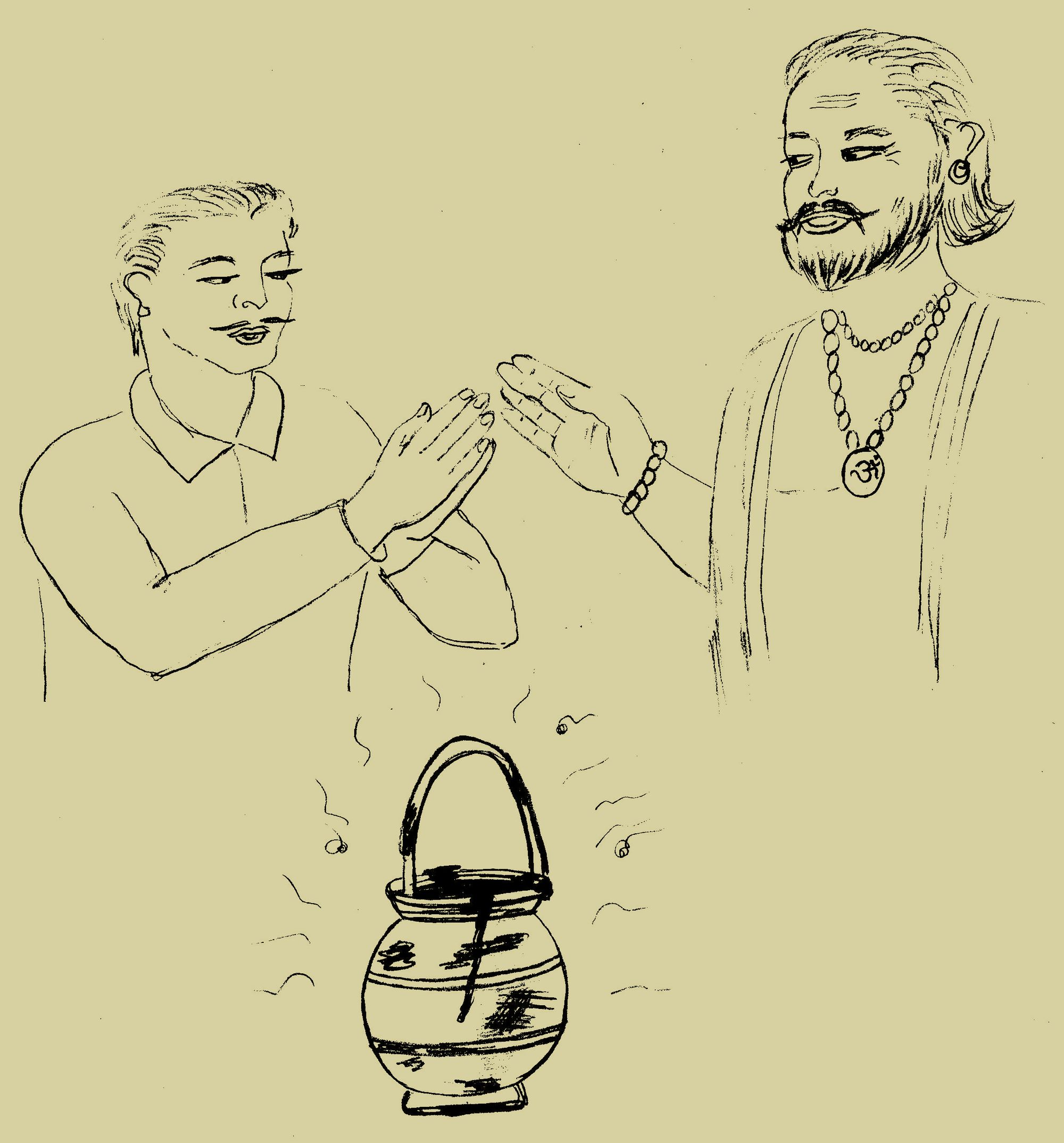 The sage smiled and said, “Alright, I plan to visit your city anytime after the tenth of this month. I shall visit you while I am there.” The man went back to work but he was counting the days. On the tenth of the month he got his house cleaned till it shone. He got special food prepared in the hope that the sage would drop by. That day too went by. There was no sign of the sage. Another five days passed in waiting and preparing for the sage to come. On the sixth day the sage knocked at the door. The man was overjoyed to see the sage. He welcomed him and offered him food. The sage extended his kamandalu and said, “Just put it into this.” The man was about to pour kheer into the kamandalu when he noticed that there was some cow-dung in the kamandalu. He said, “Oh venerable one! Give the kamandalu to me. Let me wash it. It is not clean. How can I pour kheer into this soiled utensil?”