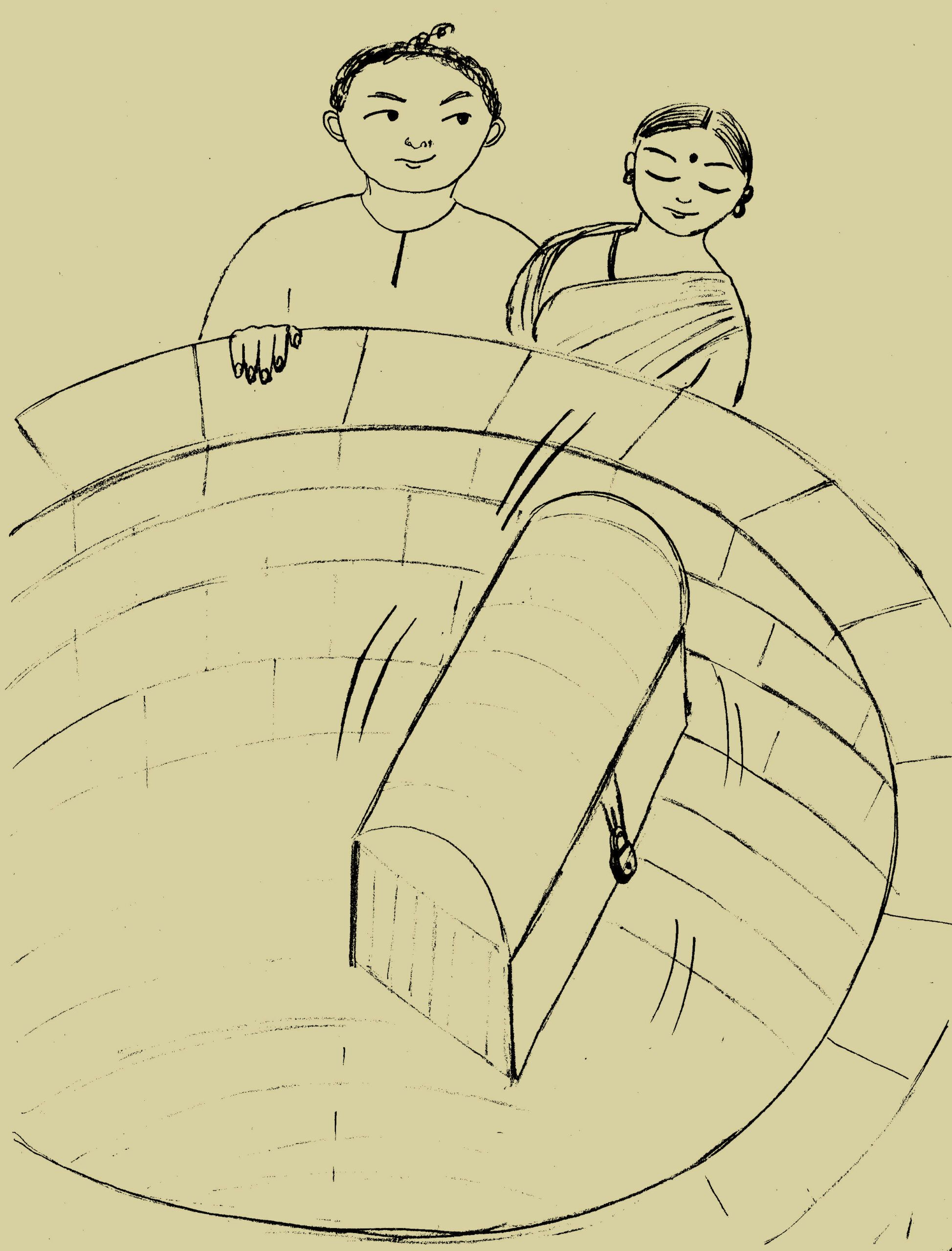 Soon the couple came out of the house lugging a large and heavy iron chest. A padlock was dangling over the bolt. They dragged the chest to the well and somehow managed to throw it down the well. It hit the bottom of the well with a big splash. The man heaved a sigh of relief and said, “At last, now we can sleep in peace. Come let us go indoors.”