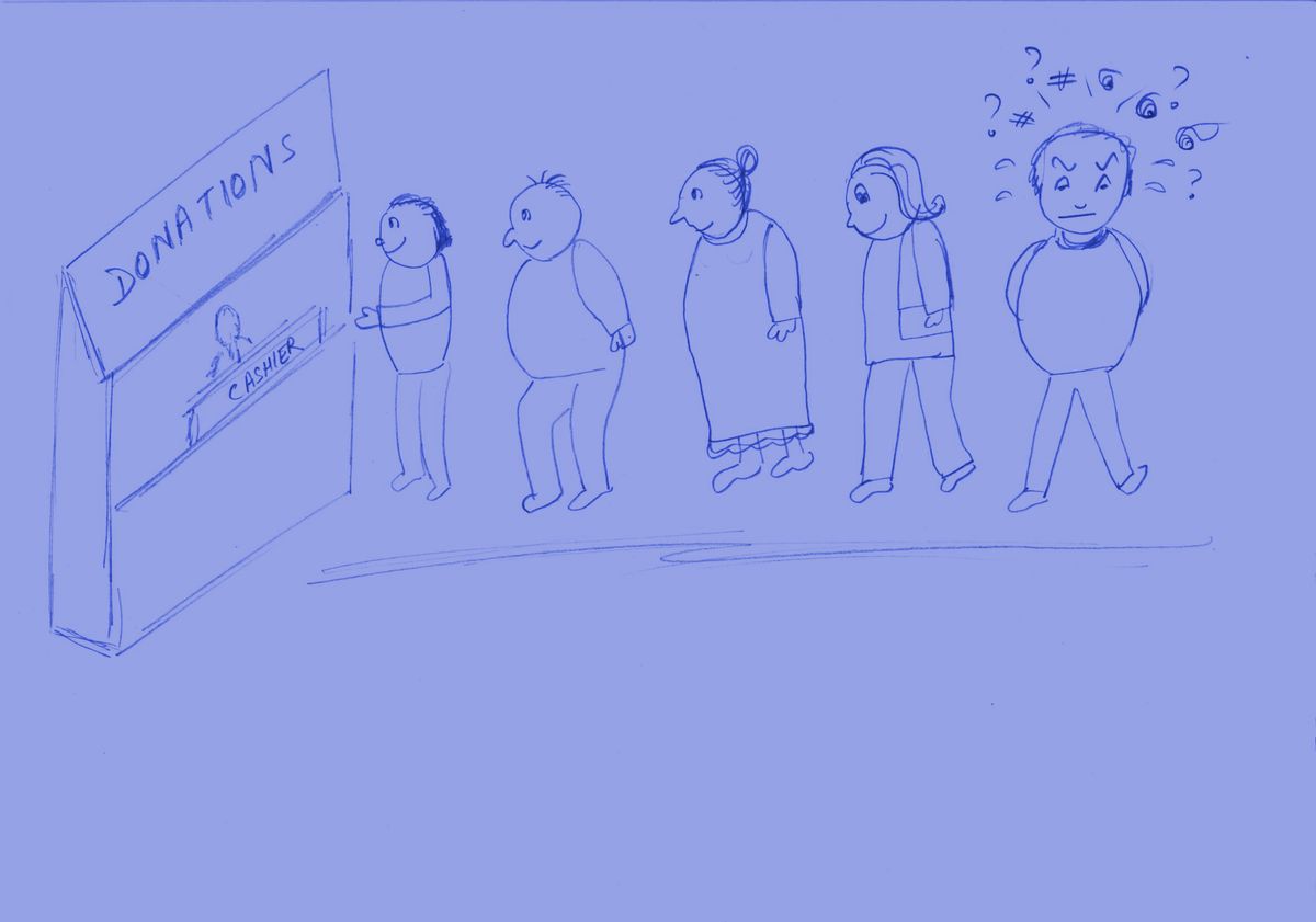By then he stood facing the cashier. “Yes sir! How much would you like to donate?” The man was so confused by now that he said, “Excuse me, I will just be back. I need to go to the washroom urgently.”