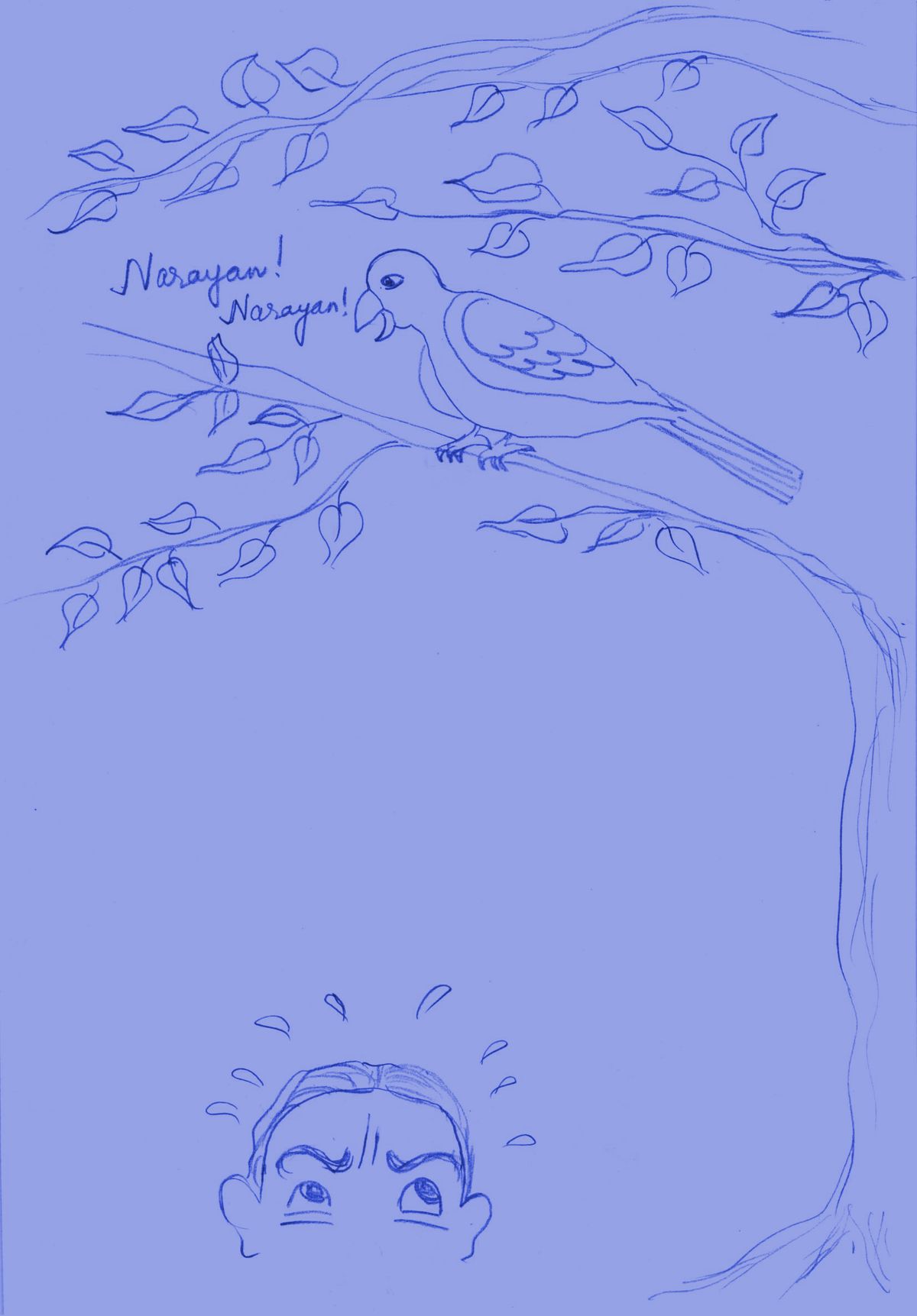 When he started to meditate under a tree, a parrot perched on the branch above him sang, “Narayan, Narayan …” Hrinakshyapu tried his best to concentrate but could not. He tried to shoo away the bird, but the bird flew around a bit, and came to sit on one of the branches and started chanting again, “Narayan, Narayan …” Exasperated after many efforts, he went to a hill top to meditate.