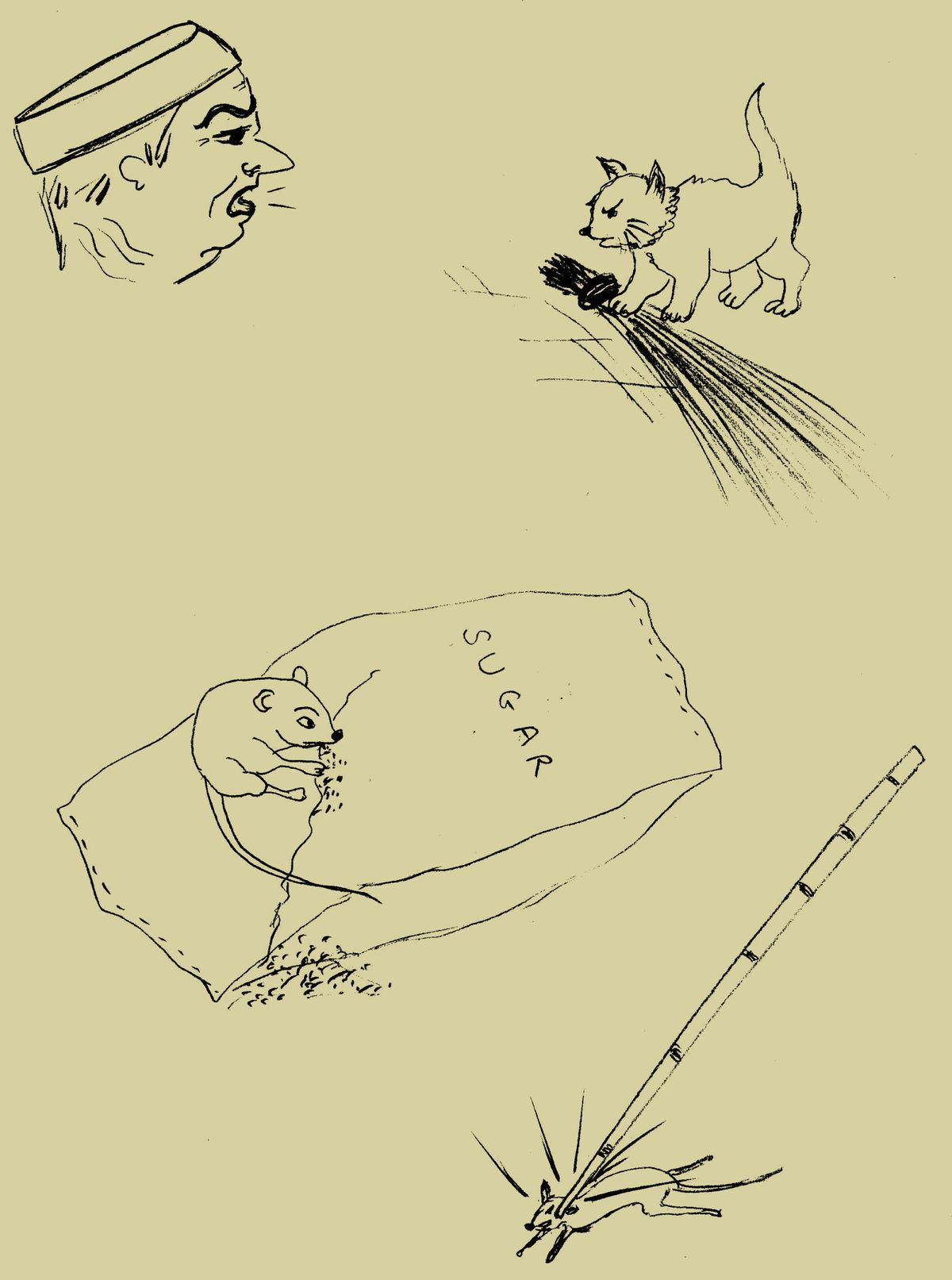 The story does not end here. One day the son spotted a rat in a corner of his shop. It was gnawing at one corner of a gunny bag containing sugar. The son took a broom and hit the rat. It scampered away squealing, “Ouch, don’t hit me, my son! It is I, your father….” The son swept the wriggling reptile out of the shop. The next day the son saw a rat nibbling at the corner of a bag of rice; somehow he was quite sure that it was the same rat that he had thrown out yesterday. And he was right! The poor rat (father) got a sound thrashing with the broom! For days it hovered around the shop; his dearly beloved shop! How he wanted to go in there, but he could not dare to for he had already had two sound thrashings!