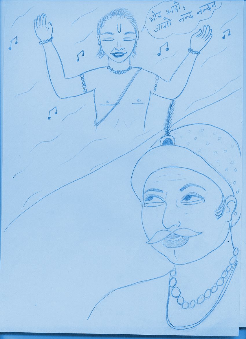In the wee hours of the morning, Akbar woke up to the sound of someone singing. He listened intently. The singer was singing a devotional song, to wake up the baby Krishna sleeping in His cradle. So sweet were the notes and so heavily were they drenched in love and devotion that the voice was divine and sweet beyond words. Akbar was totally immersed in the sweet nectarine words and intoxicating music. Tansen woke up to find Akbar totally overwhelmed by the sweetness of the song that he was unconsciously an audience to. Tansen whispered into the ear of the Emperor, “My Lord that is my Guru Haridas.”