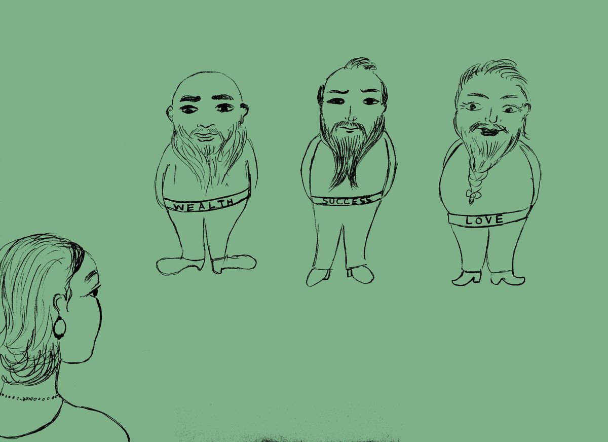 In the evening when her husband came home, she told him what had happened. “Go tell them I am home and invite them in!” The woman went out and invited the men in. “We do not go into a house together,” they replied. “Why is that?” she wanted to know. One of the old men explained, “His name is Wealth,” pointing to one of his friends, and then, pointing to the other one, “He is Success, and I am Love.” Then he added, “Now go in and discuss with your husband which one of us, you want in your home.”