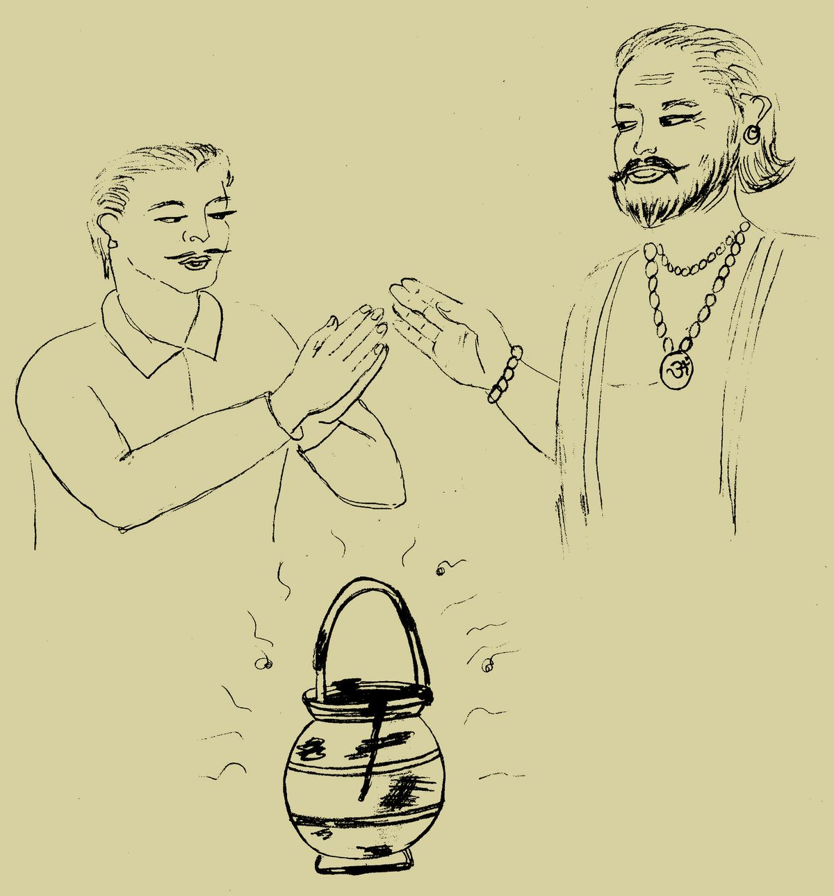 The sage smiled and said, “Alright, I plan to visit your city anytime after the tenth of this month. I shall visit you while I am there.” The man went back to work but he was counting the days. On the tenth of the month he got his house cleaned till it shone. He got special food prepared in the hope that the sage would drop by. That day too went by. There was no sign of the sage. Another five days passed in waiting and preparing for the sage to come. On the sixth day the sage knocked at the door. The man was overjoyed to see the sage. He welcomed him and offered him food. The sage extended his kamandalu and said, “Just put it into this.” The man was about to pour kheer into the kamandalu when he noticed that there was some cow-dung in the kamandalu. He said, “Oh venerable one! Give the kamandalu to me. Let me wash it. It is not clean. How can I pour kheer into this soiled utensil?”