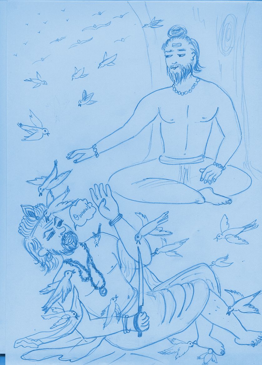 The king was beside himself with rage. He said, “Your impertinence is intolerable. I shall behead you just now!” He drew out his sword and raised it to strike the sage. In an instant, hundreds of birds flew up and attacked the king. They poked their beaks into his face, his eyes and his arms and all over. The king moved his arms up and around to ward off the birds. But the birds wouldn’t leave him. The sage said, “Leave him! Leave him! Come to me my dears!” All at once, the birds quietened down and sat meekly at the feet of the sage.